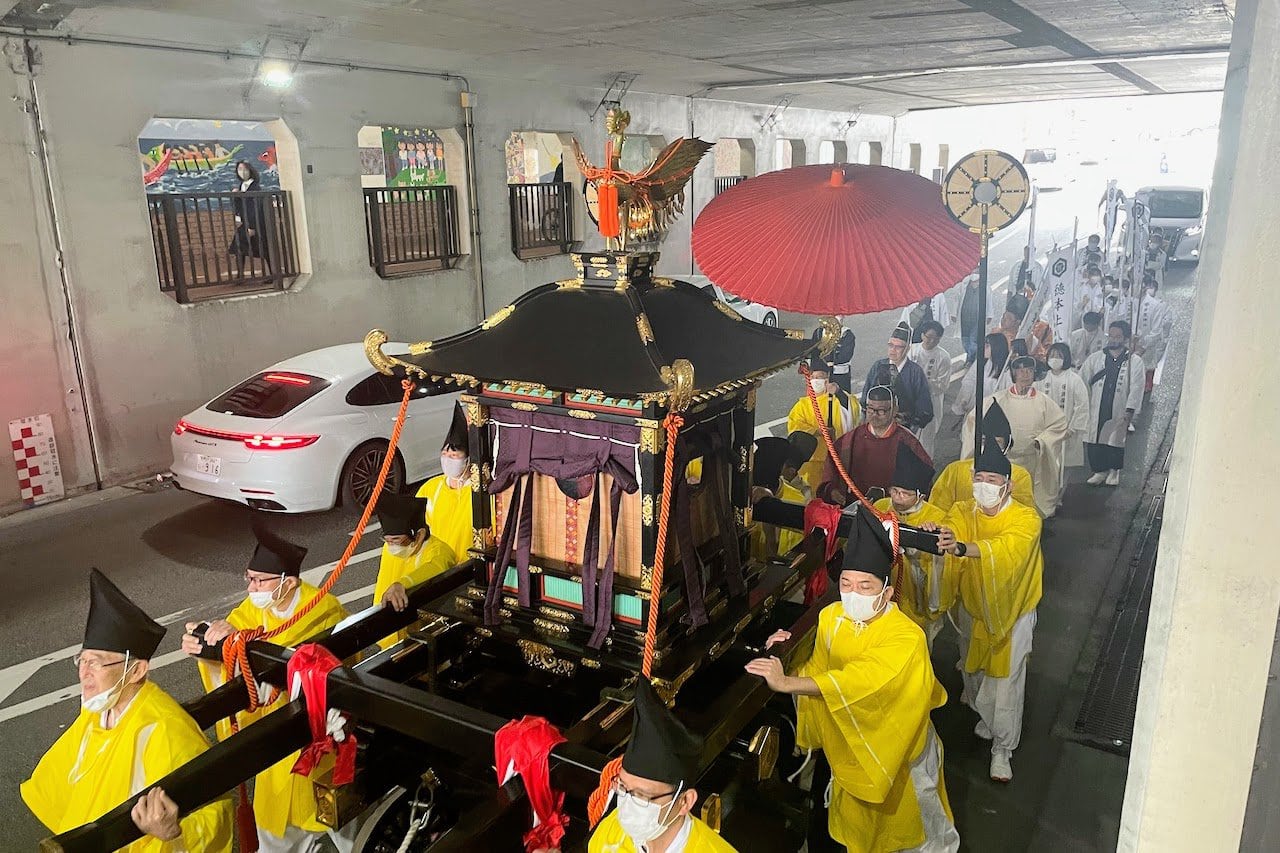 ↑前回・2023年開催時のようす。金色の鳳凰が屋根の上にのった「鳳輦(ほうれん)」です。昭和初期に作られたものだそう〜