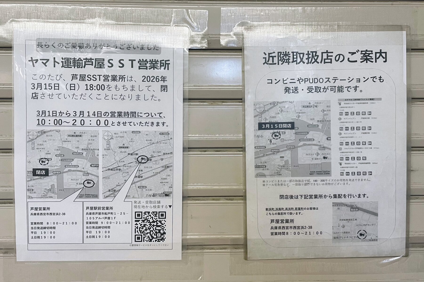高浜町の「グルメシティ 芦屋浜店」1階にある「ヤマト運輸 芦屋シーサイドタウン営業所」が3月15日(日)18:00をもって閉店するそうです。