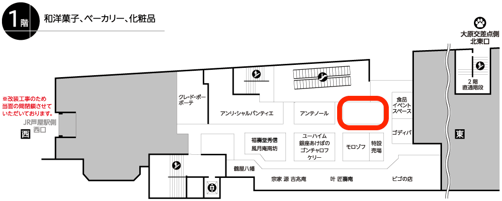 ↑1階エスカレーター横ということで、マップの赤色で囲ったあたりにオープンすると思われます〜