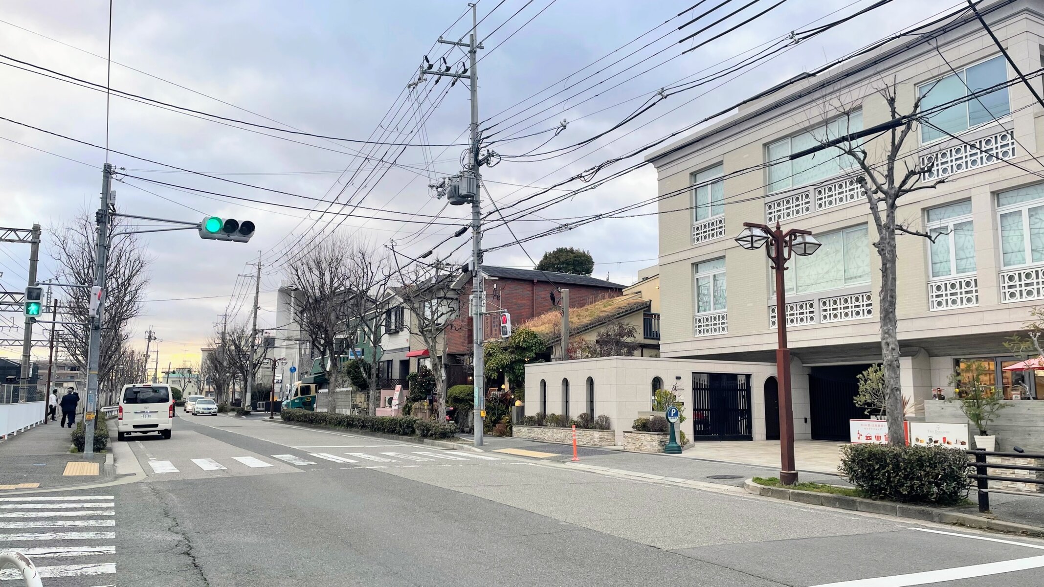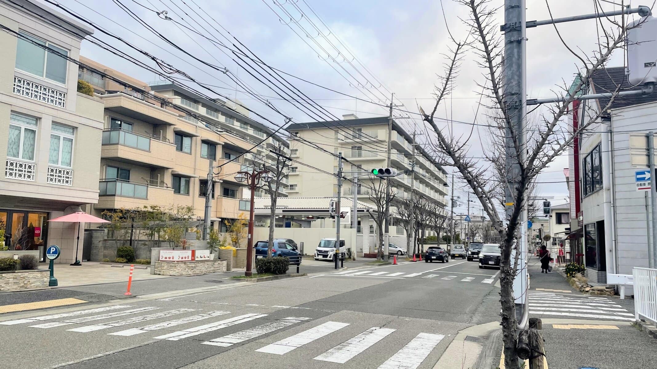 ↑こっち(東)へ行くと、ガソリンスタンド「apollostation 芦屋東山SS/宇佐美エナジー」、「尼崎信用金庫 芦屋支店」、「グランドフードホール 芦屋」、「セブン-イレブン 芦屋東山町店」などがあり、宮川けやき通り方面です。