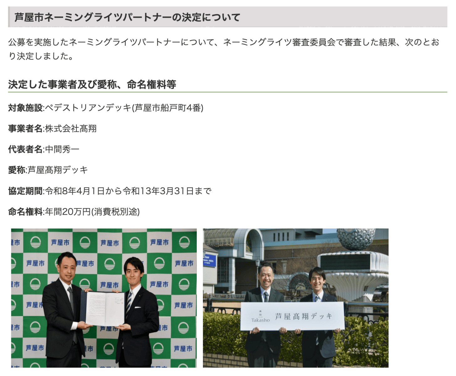 JR芦屋駅北側にある「ペデストリアンデッキ(歩行者通路)」のネーミングライツ(愛称の命名権)パートナーが決定し、愛称が「芦屋髙翔デッキ」になるみたいです〜