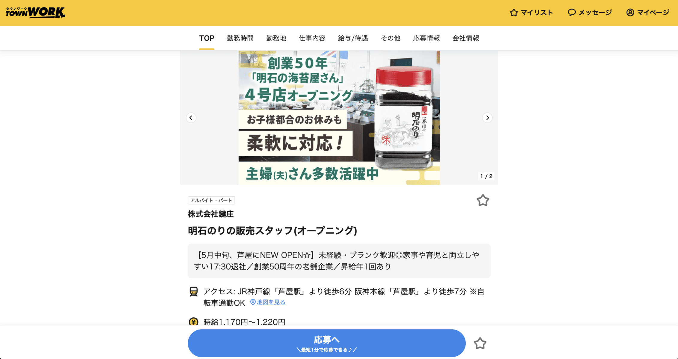 タウンワークよりスクリーンショット