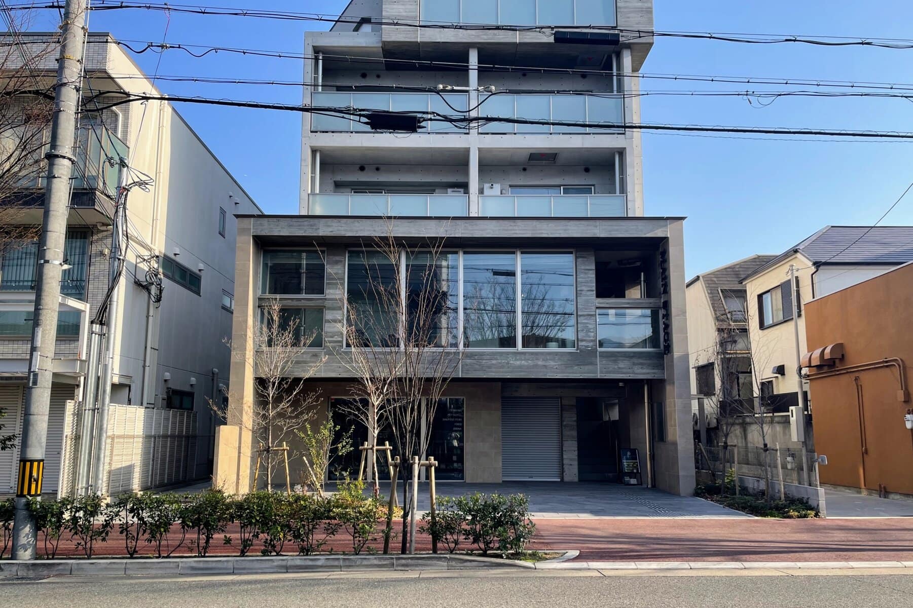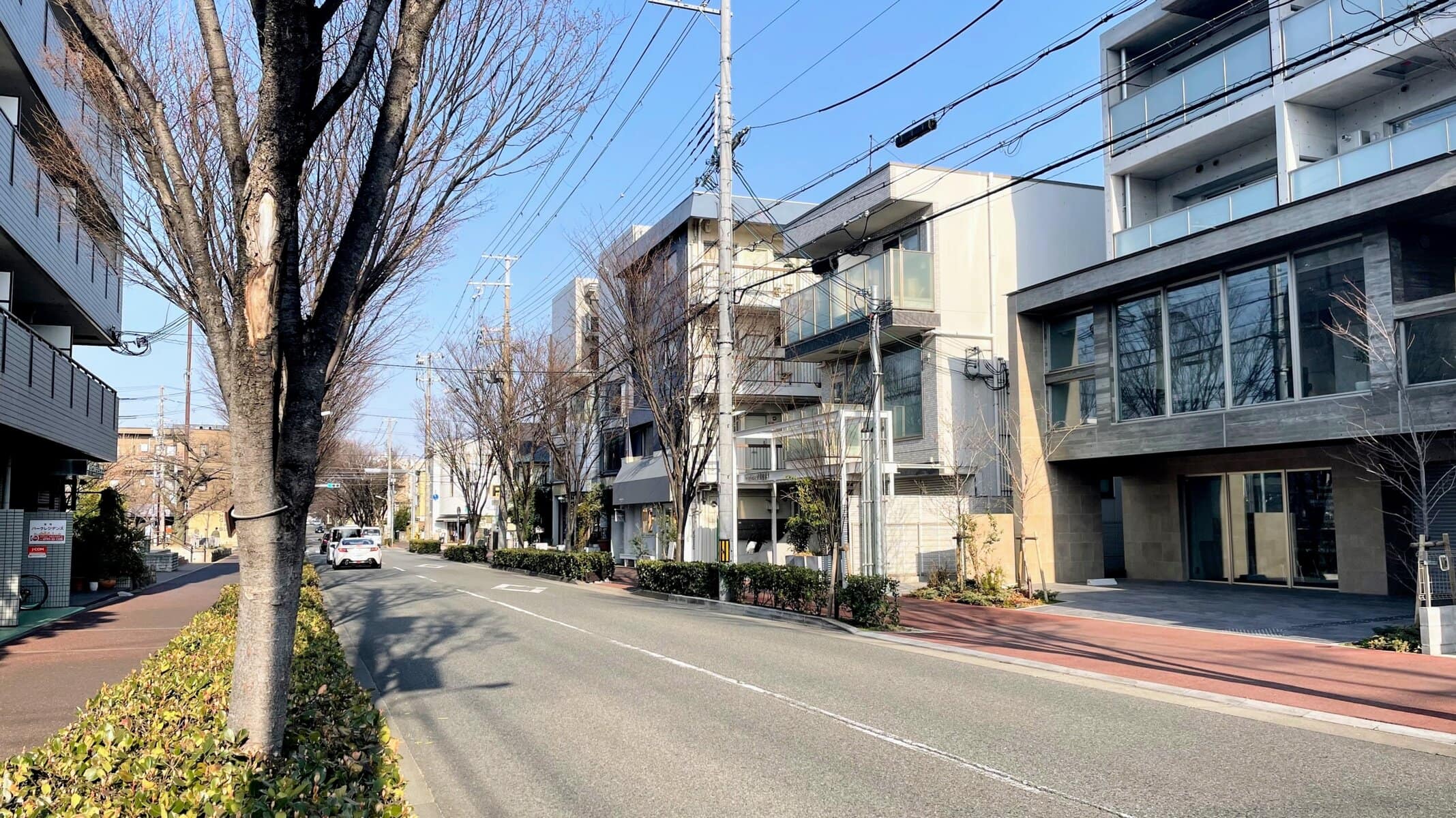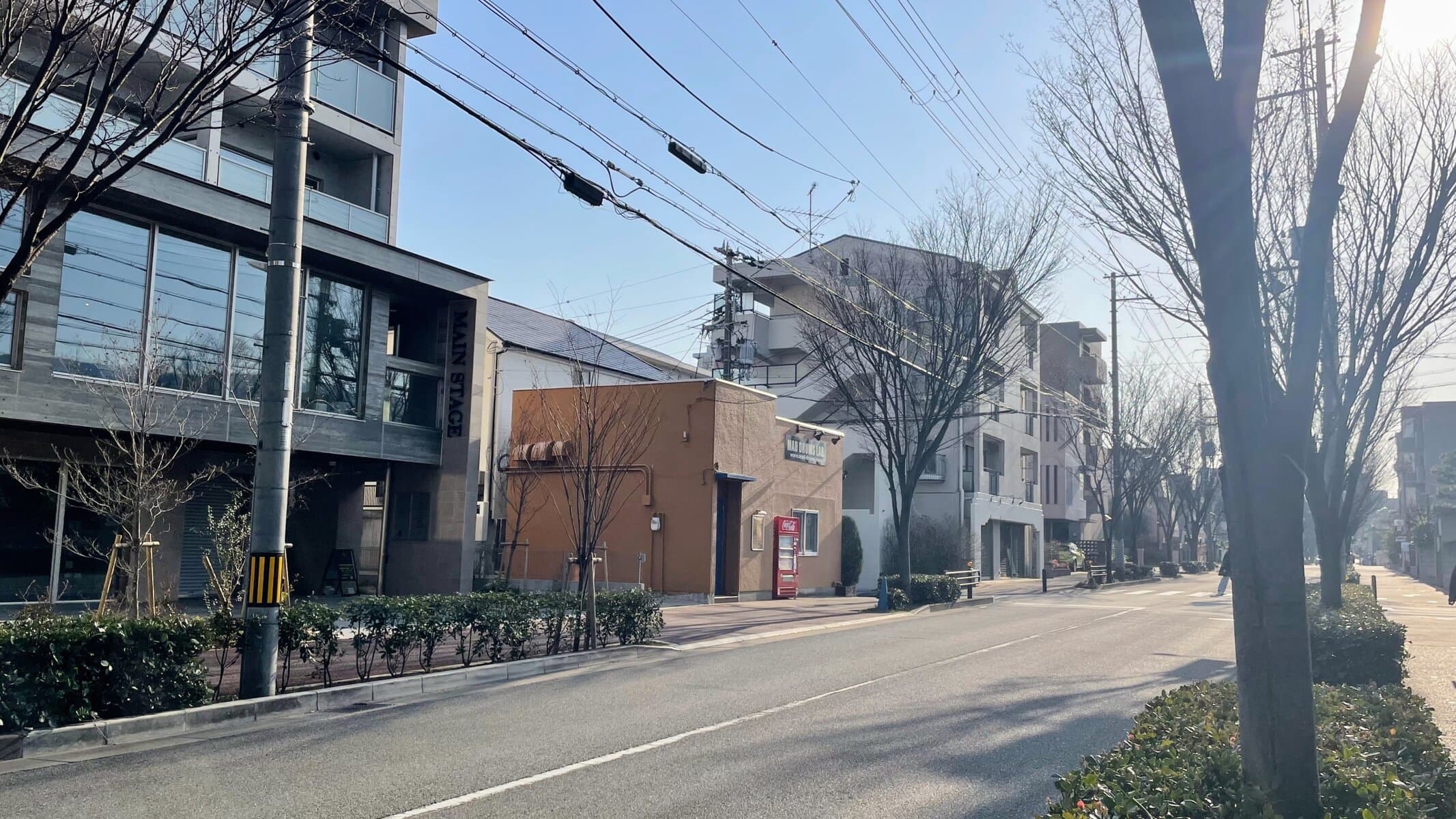 ↑鳴尾御影線の南側にある「メインステージ芦屋パークサイド」の1階。向かって左隣は、ペットブランド販売店「asone 芦屋店」が今年オープン予定の「パークフロント芦屋宮塚」、右隣はドラムスクール「マッドドラム ラボ」です。