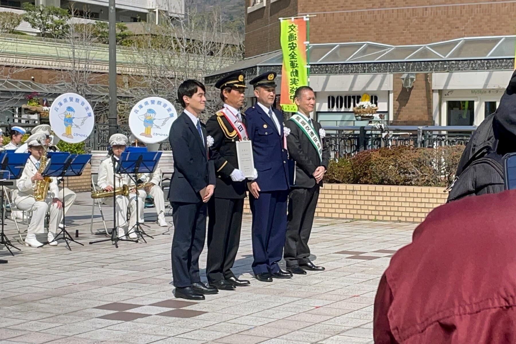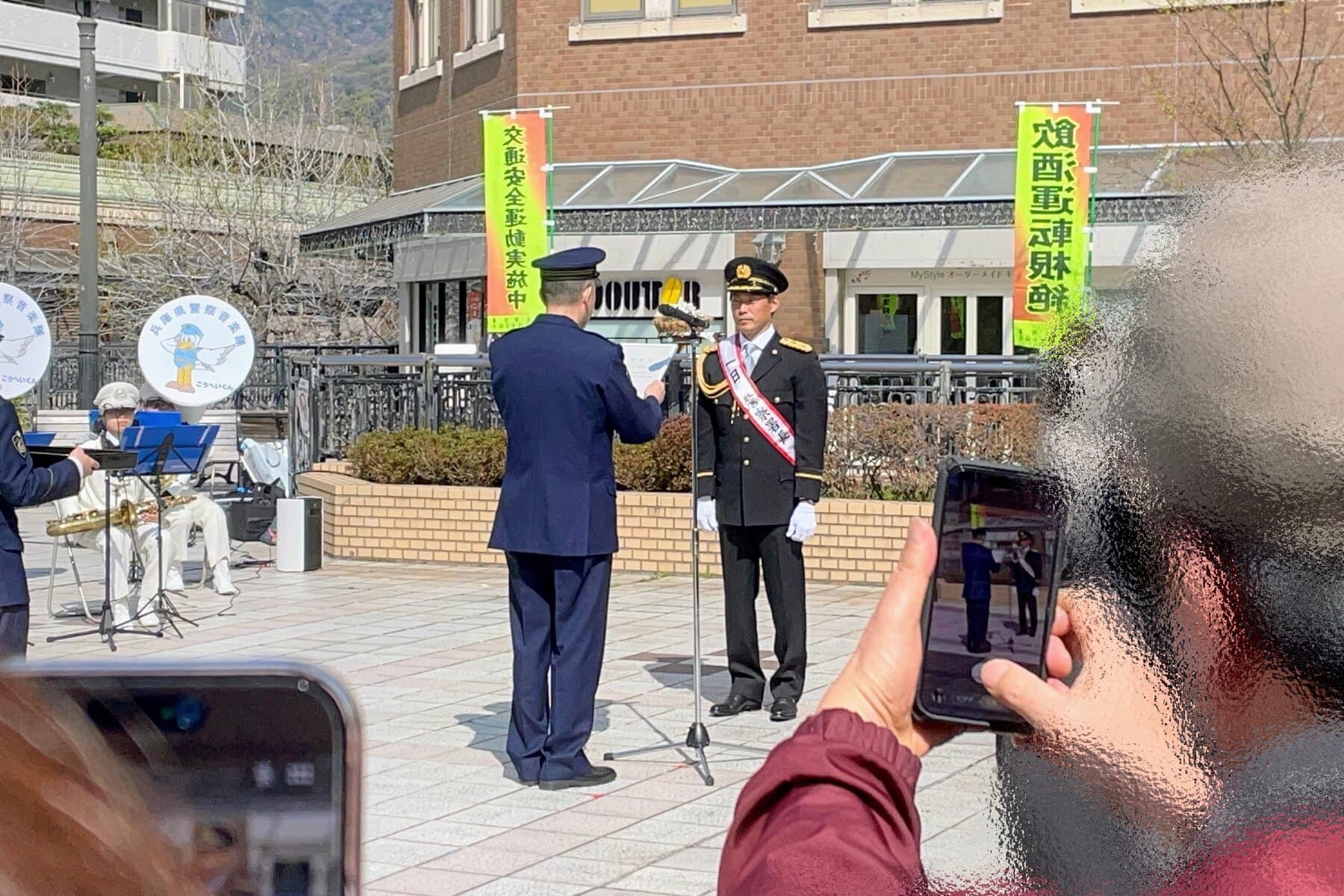 昨日4月3日、JR芦屋駅前で「春の全国交通安全運動」プレイベントが行われ、プロ野球・阪神タイガースOBの桧山進次郎さんが一日警察署長を務めました〜