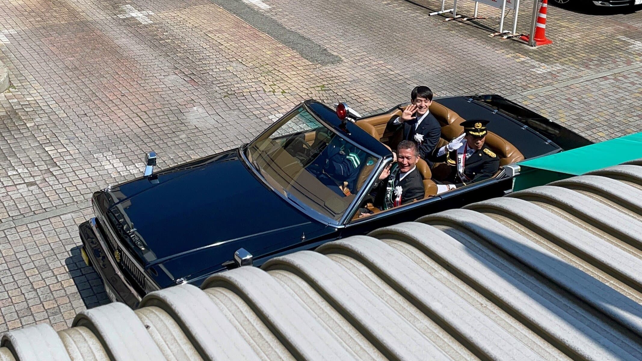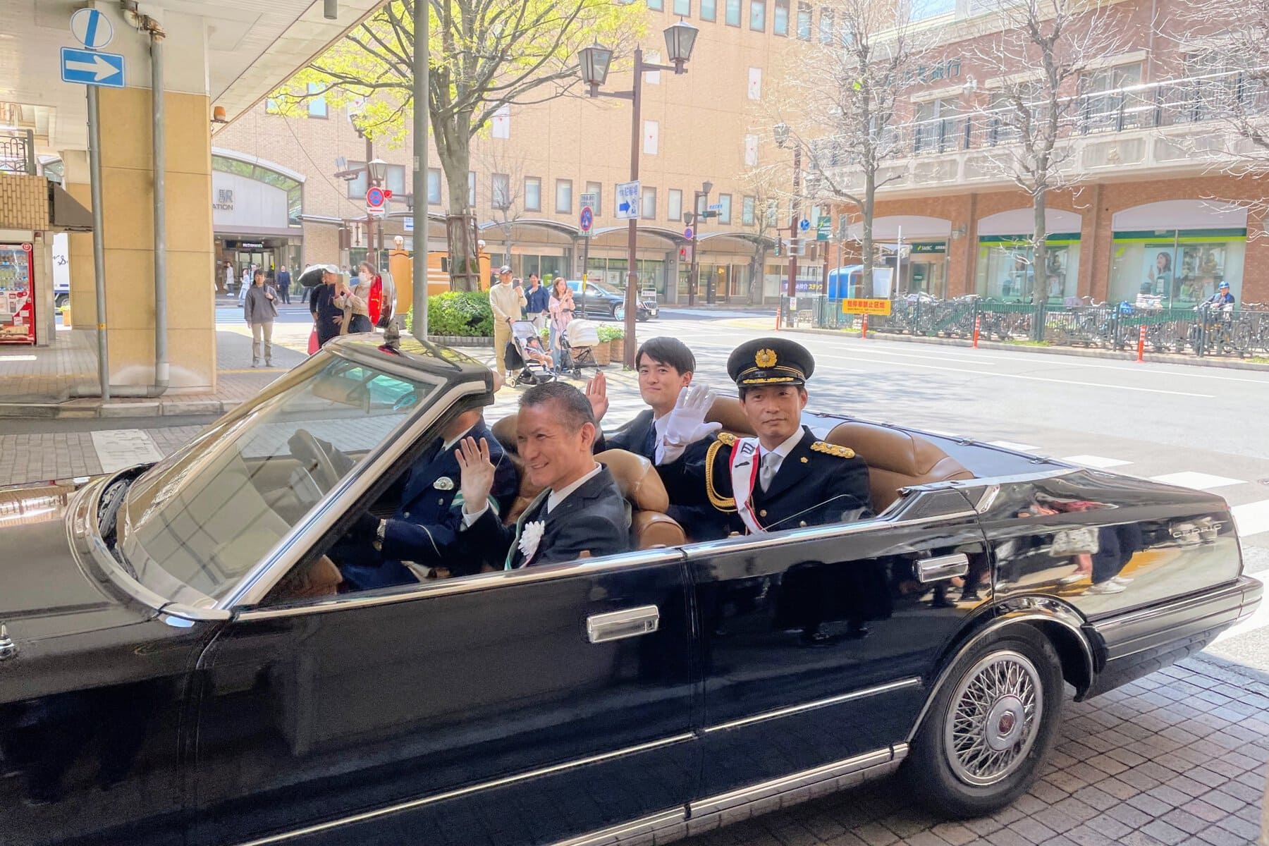 ↑桧山さんと高島市長は並んでオープンカーに乗車!