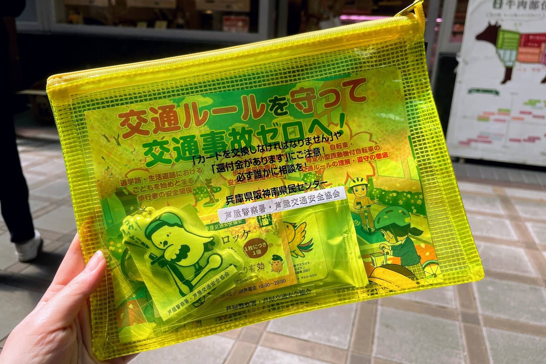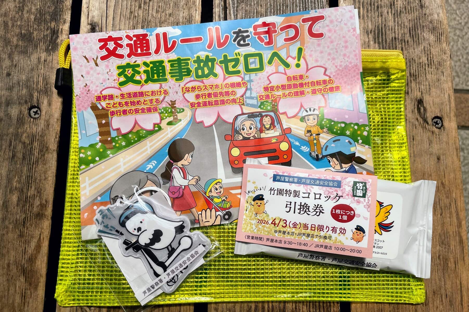 ↑交通安全啓発チラシのほか、リフレクターキーホルダーと、ウェットティッシュ、そしてなんと「竹園特製コロッケ引換券」(当日限り有効)が!