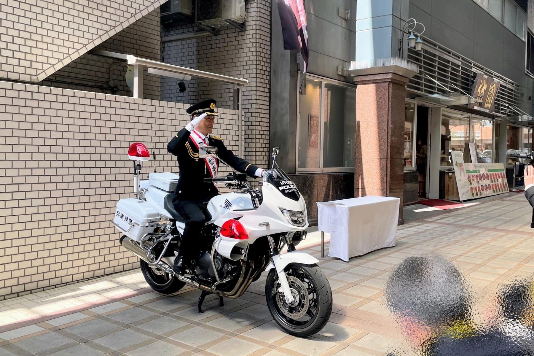 ↑その後も桧山さんは取材や記念撮影などに応じられていました〜。白バイにまたがってカッコイイ!