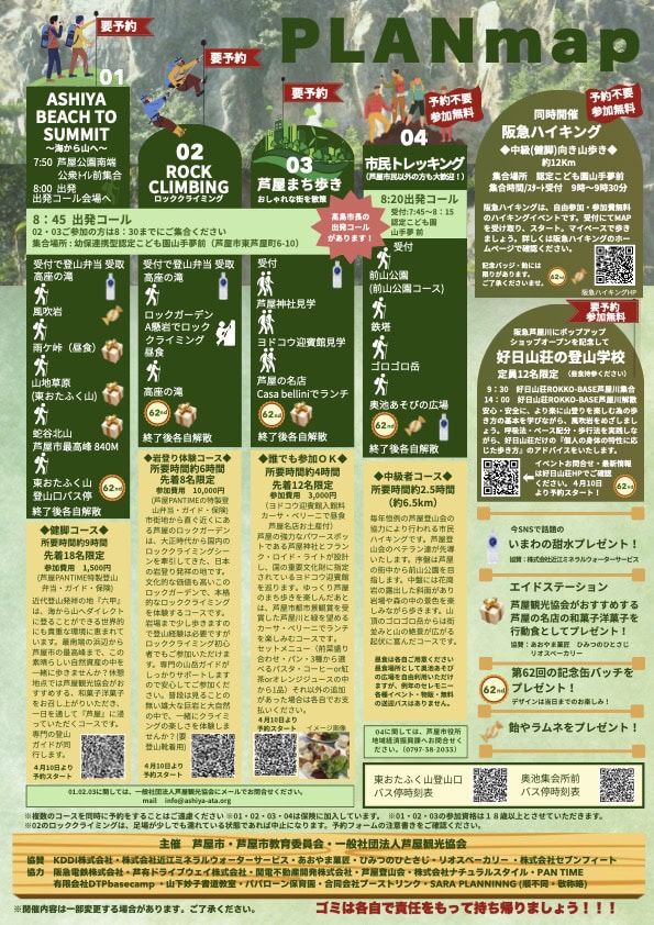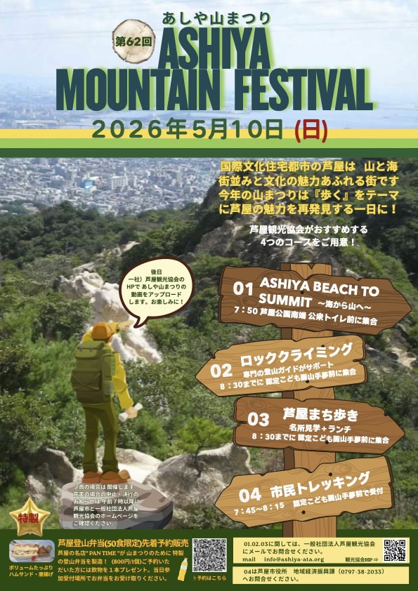 海から山まで歩くコースに、岩登りやまち歩きまであって、芦屋の自然と街の魅力をまるごと楽しめそうなイベントです〜。特製登山弁当もかなり気になりますし、普段とは違う芦屋を体験したい方は行ってみては。