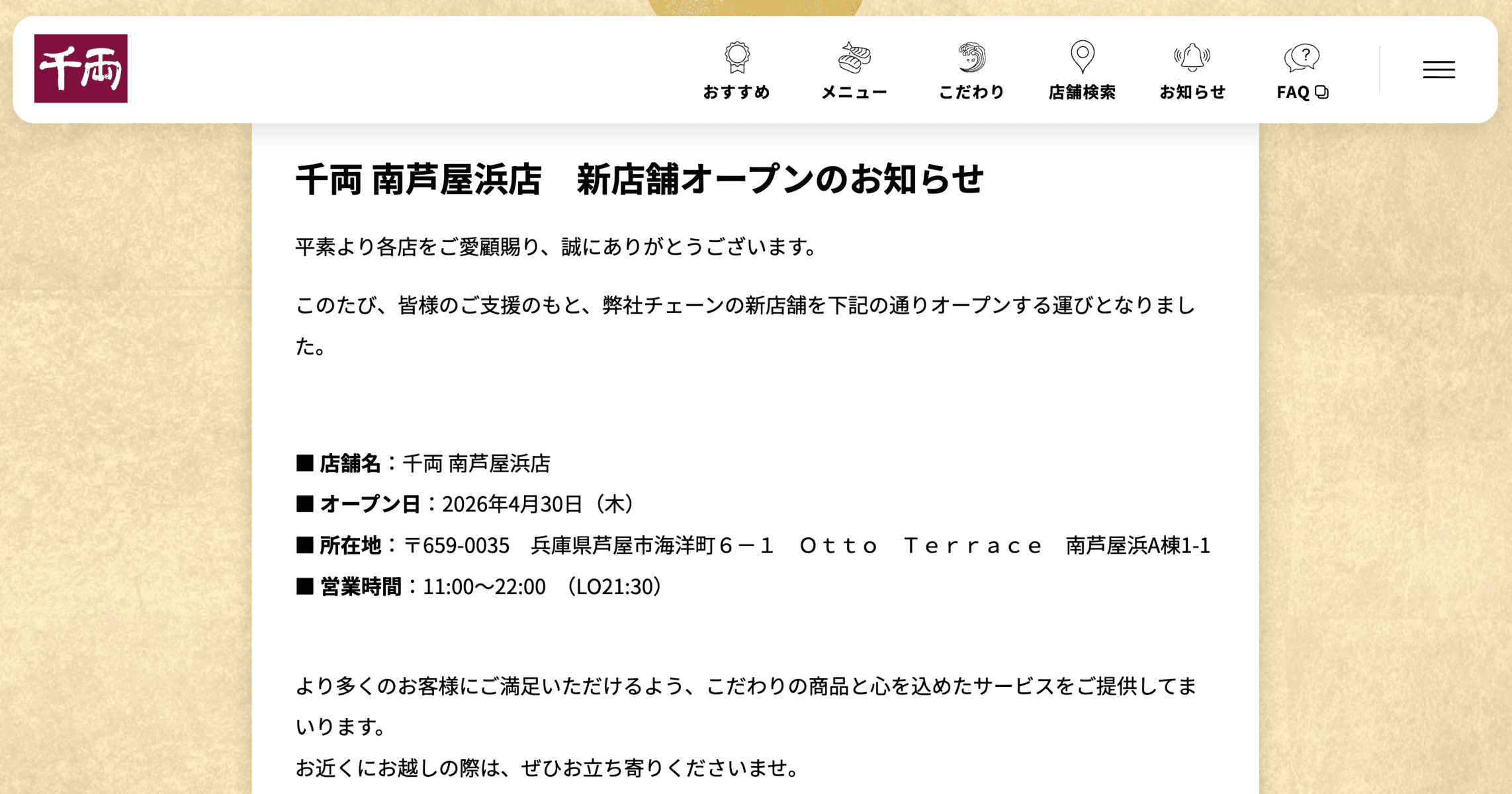 南芦屋浜エリア・海洋町の新ショッピングモール「Otto Terrace 南芦屋浜」に回転寿司店「千両 南芦屋浜店」が4月30日(木)からオープンするみたいです〜