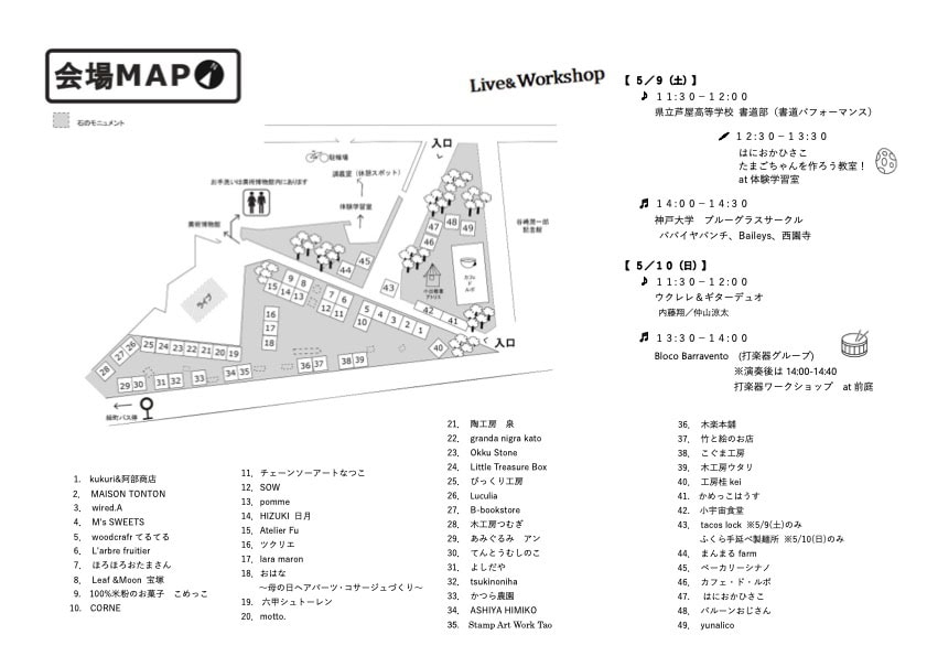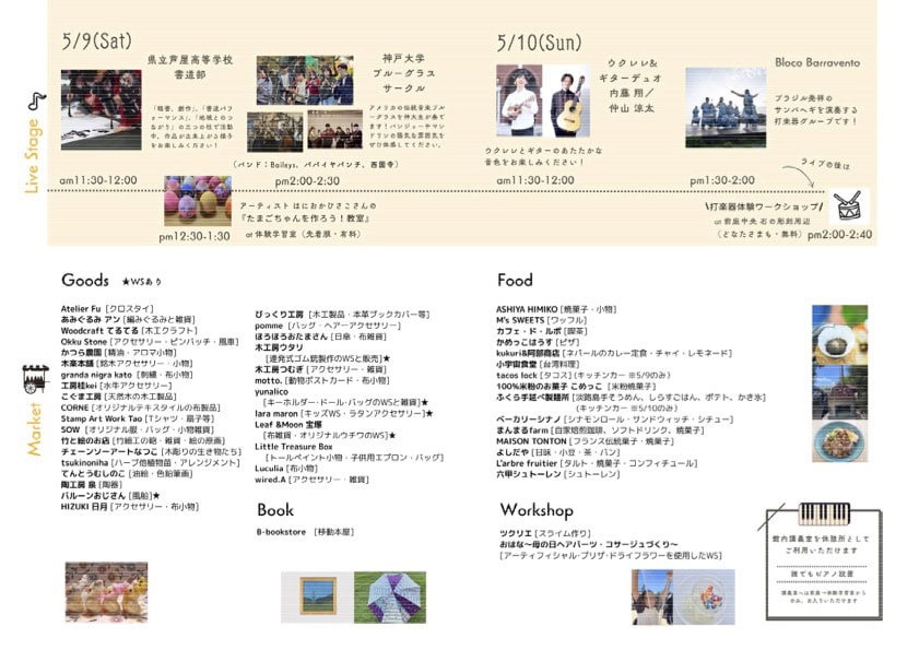 芦屋市立美術博物館の前庭で「ART MARKET あしやつくるば」が5/9(土)10(日)に開催されるみたい。食品・雑貨・古書・ワークショップなど出店、音楽ライブも