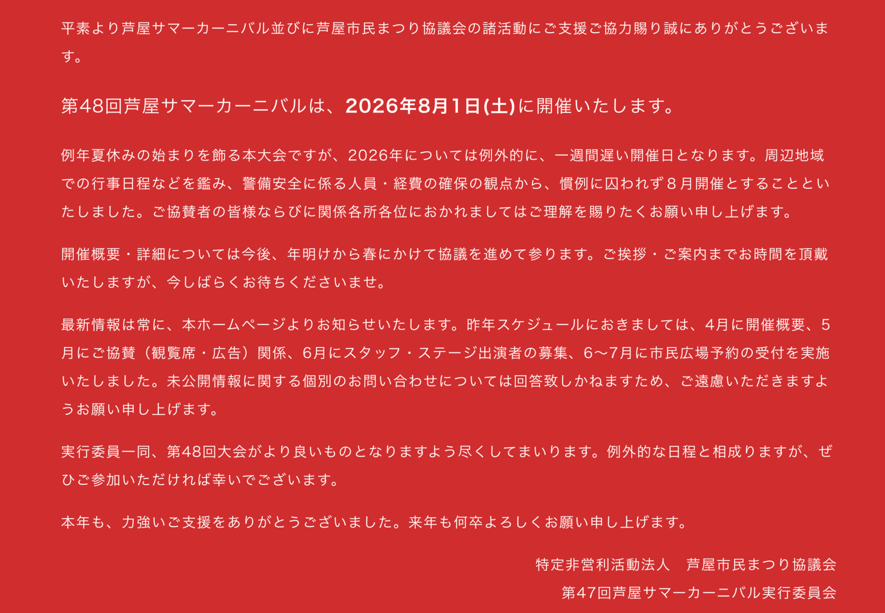 今年の「第48回芦屋サマーカーニバル」8月1日(土)開催に決定してます〜