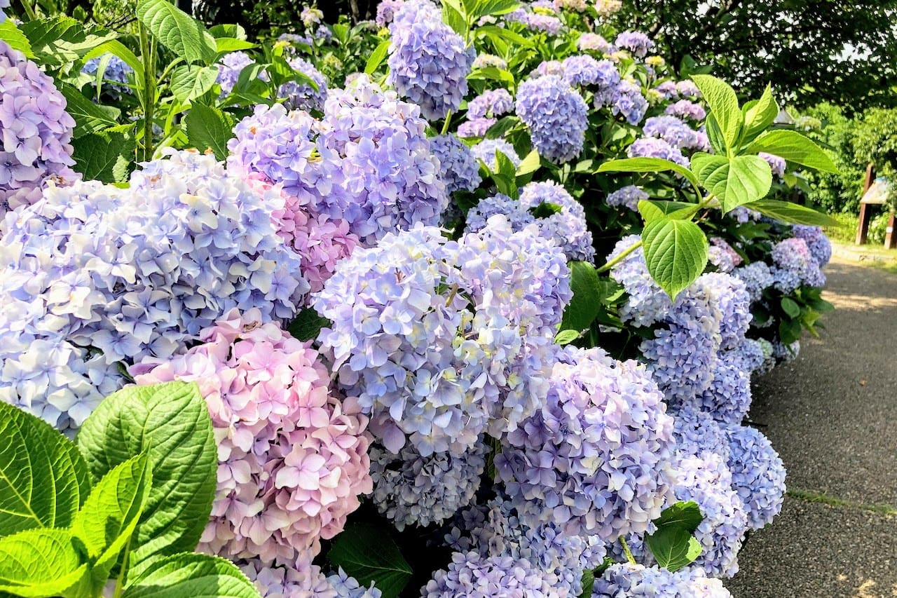清水町の、国道2号線からJR線の手前まで南北に長く続く「清水公園」に植えられている紫陽花(あじさい)がちょうど見頃を迎えていました。