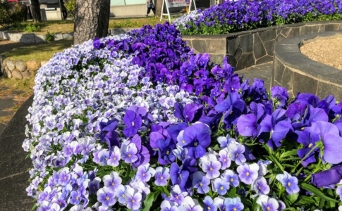 芦屋フォト業平橋の東側にある業平公園内、芦屋市商工会館前にある花壇に紫色のパンジーが満開で綺麗でした。 4月26日撮影。 白&紫のパンジーと紫単色のパンジーが円形の花壇に寄植えされています。 密度もあって見事な花壇です。 真ん中の...