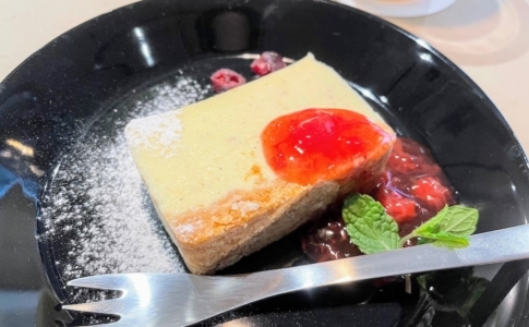 『北欧家具とCAFE also』の自家製チーズケーキとりんごジュース(阪神深江駅前)【あしつーグルメ】